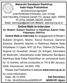 महर्षि सान्दीपनि राष्ट्रीय वेदविद्या प्रतिष्ठान से सम्बद्ध राष्ट्रीय आदर्श वेदविद्यालय के परिसरों में सहयोगी शैक्षणिक (आधुनिक विषय) सेवा हेतु साक्षात्कार अधिसूचना