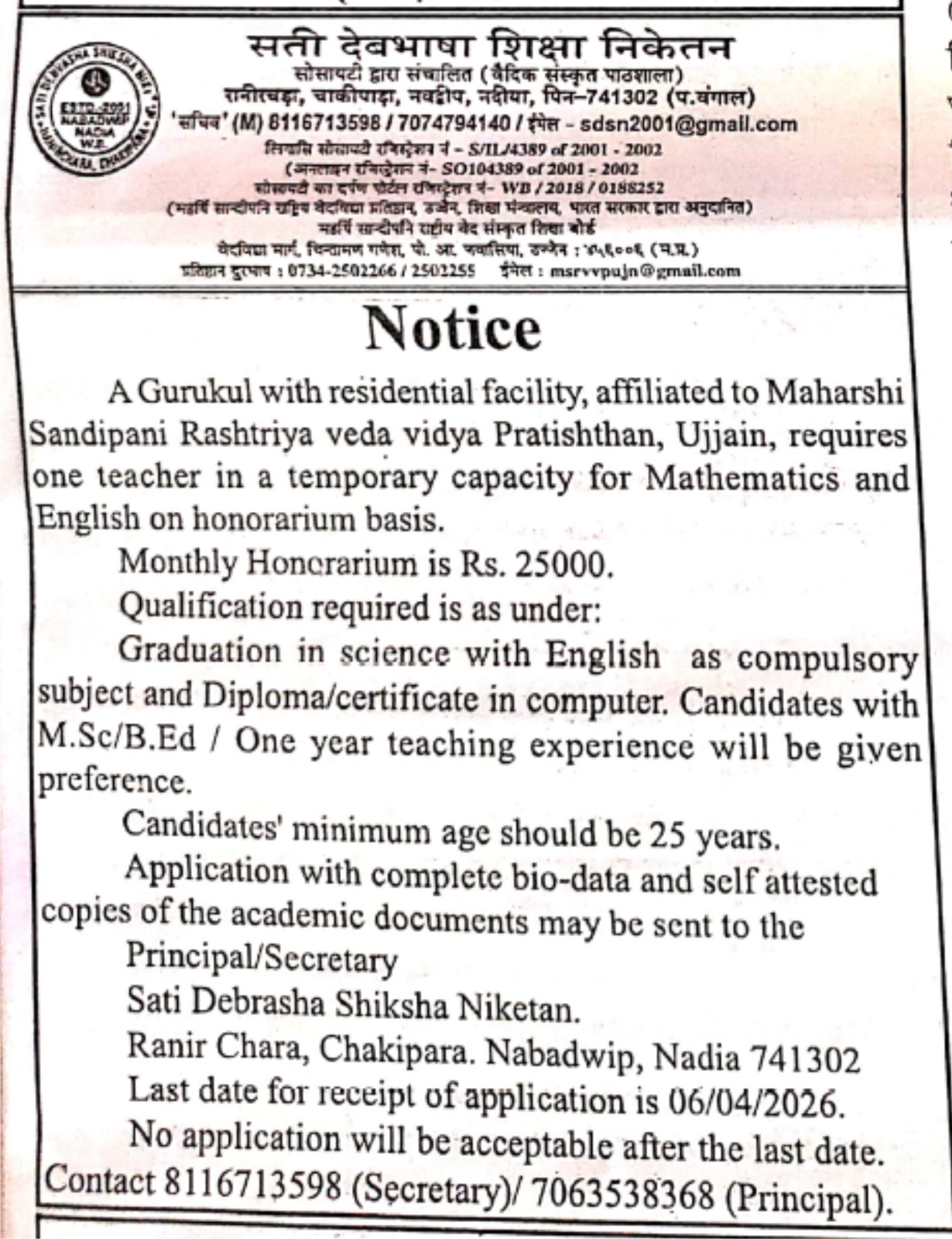 | स्वामी वेदान्ती वेद विद्यापीठ, वाराणसी (उ.प्र) | Modern Teacher Advertisement Date of Upload :29/11/2021 |