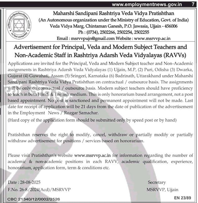 महर्षि सान्दीपनि राष्ट्रीय वेदविद्या प्रतिष्ठान से सम्बद्ध राष्ट्रीय आदर्श वेदविद्यालय के परिसरों में प्राचार्य, शैक्षणिक (वेद अध्यापक), सहयोगी शैक्षणिक (आधुनिक विषय) एवं गैर-शैक्षणिक सेवा हेतु आवेदन-पत्र आमंत्रण - अधिसूचना Invitation for Application - Notification for engagement of Principal, Academic (Veda Teachers), Allied Academic (Modern Subjects), and Non-Academic services at the campuses of the Rashtriya Adarsh Veda Vidyalayas affiliated to Maharshi Sandipani Rashtriya Vedavidya Pratishthan