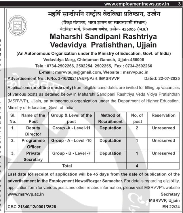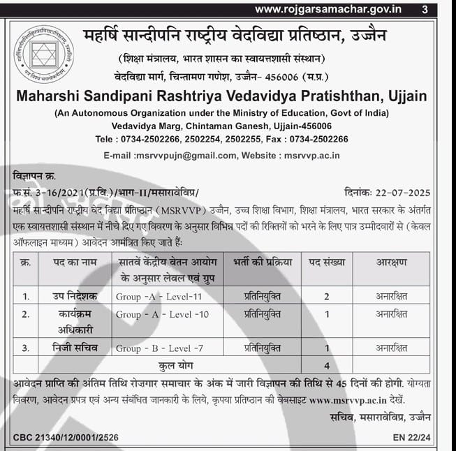 महर्षि सान्दीपनि राष्ट्रीय वेदविद्या प्रतिष्ठान, उज्जैन में विभिन्न पदों हेतु आवेदन आमंत्रित किए जाते है । / Applications are invited for various posts in Maharshi Sandipani Rashtriya Vedavidya Pratishthan, Ujjain.