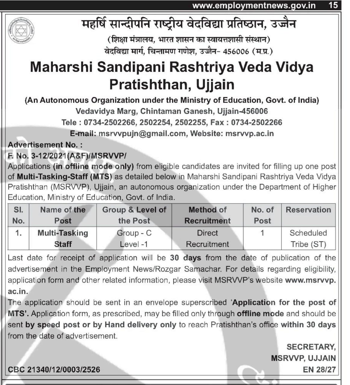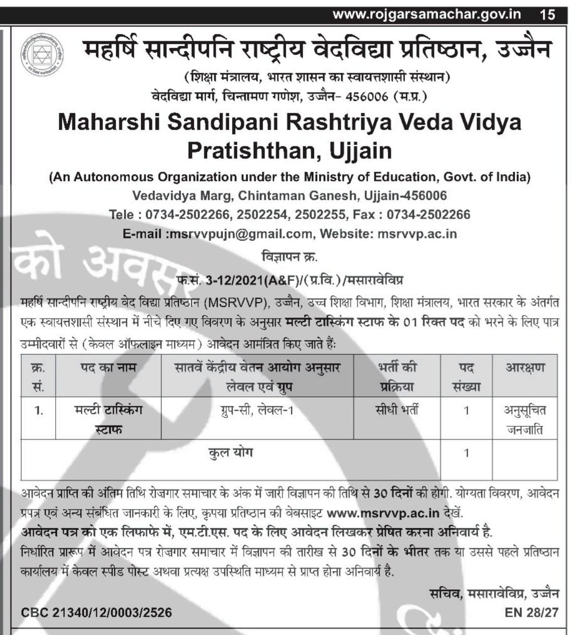 महर्षि सान्दीपनि राष्ट्रीय वेदविद्या प्रतिष्ठान, उज्जैन में मल्टी-टास्किंग-स्टाफ (एमटीएस) पद हेतु आवेदन आमंत्रित किए जाते हैं । / Applications are invited for Multi-Tasking-Staff (MTS) post in Maharshi Sandipani Rashtriya Vedavidya Pratishthan, Ujjain.