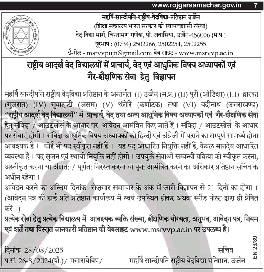 महर्षि सान्दीपनि राष्ट्रीय वेदविद्या प्रतिष्ठान से सम्बद्ध राष्ट्रीय आदर्श वेदविद्यालय के परिसरों में सहयोगी शैक्षणिक (आधुनिक विषय) सेवा हेतु साक्षात्कार अधिसूचना
