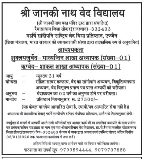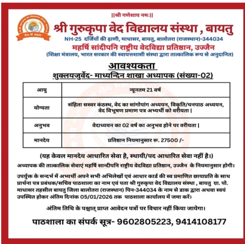 | भगवद्धर्म संस्कृत वेद विद्यालय, अलवर | Notification | Rajasthan | |