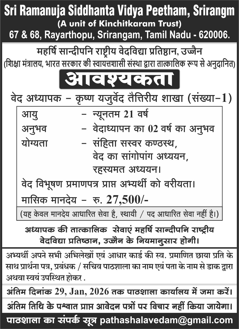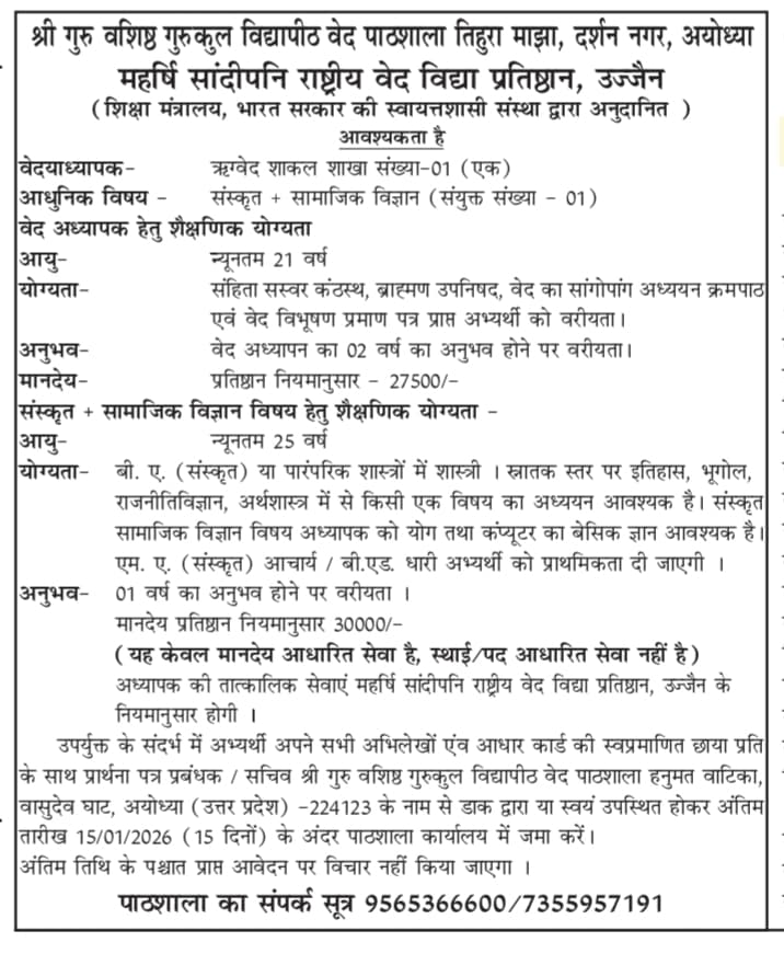 वेद पाठशाला रिक्तस्थानम् /रिक्तियाँ/ Veda Pathashala Vacancy | |||