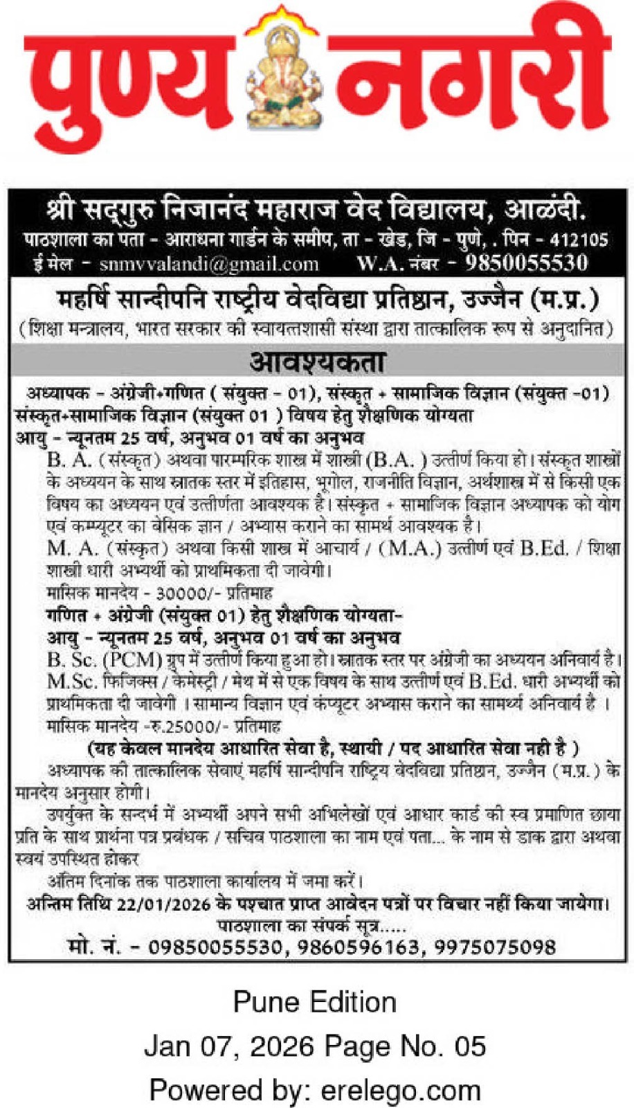 | Shri Manik Prabhu Veda Pathashala, Maniknagar | Veda Teacher Vacancy Date of Upload :08/04/2022 |