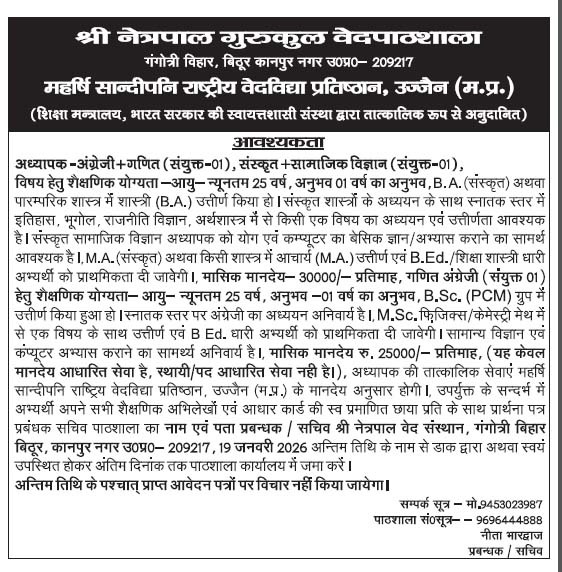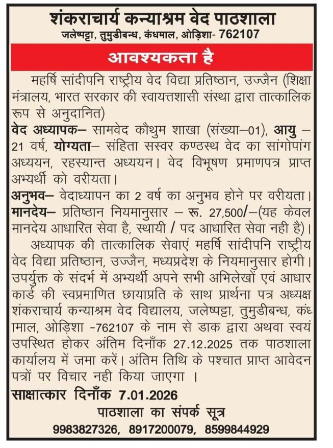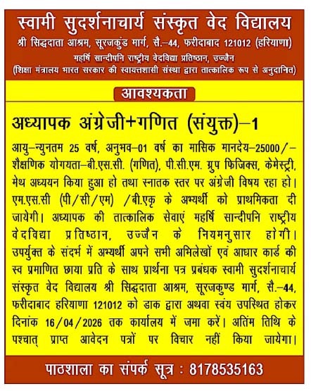 | The Vidyaranya Vidya Pitha Veda Evam Samskrit Pathashaala | Veda Teacher Vacancy Date of Upload :24/09/2021 |